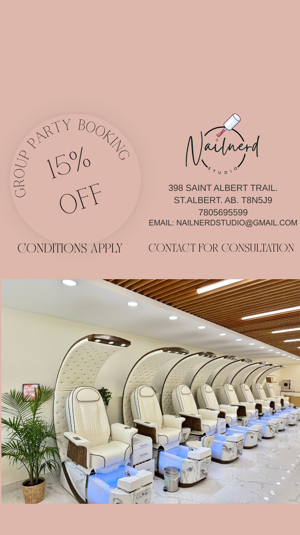 Contact: Call at 7805695599 or email: nailnerdstudio@gmail.com